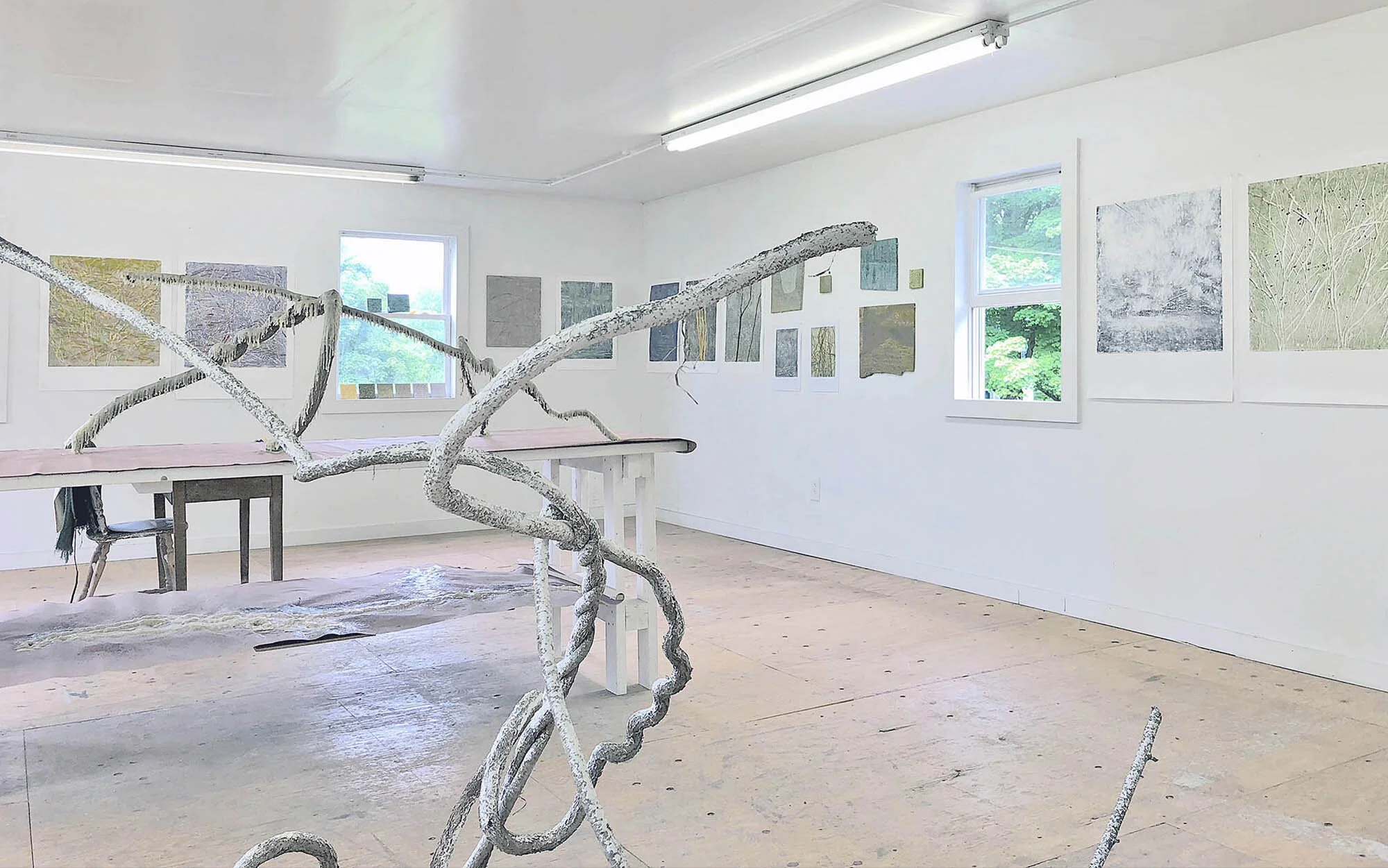 The month long May residency was the perfect time to feel a New York spring rise from the end of molting winter. I came to Residency 108 with the express purpose of reading and listening to the landscape to make paintings and mono-print drawings informed by the charged natural surrounds, continuing a refinement of a visual shorthand that echoes my internal logic. This process relies on a reverence for tacit knowledge, a tactile intuition, learning through obsessive making before thinking.
